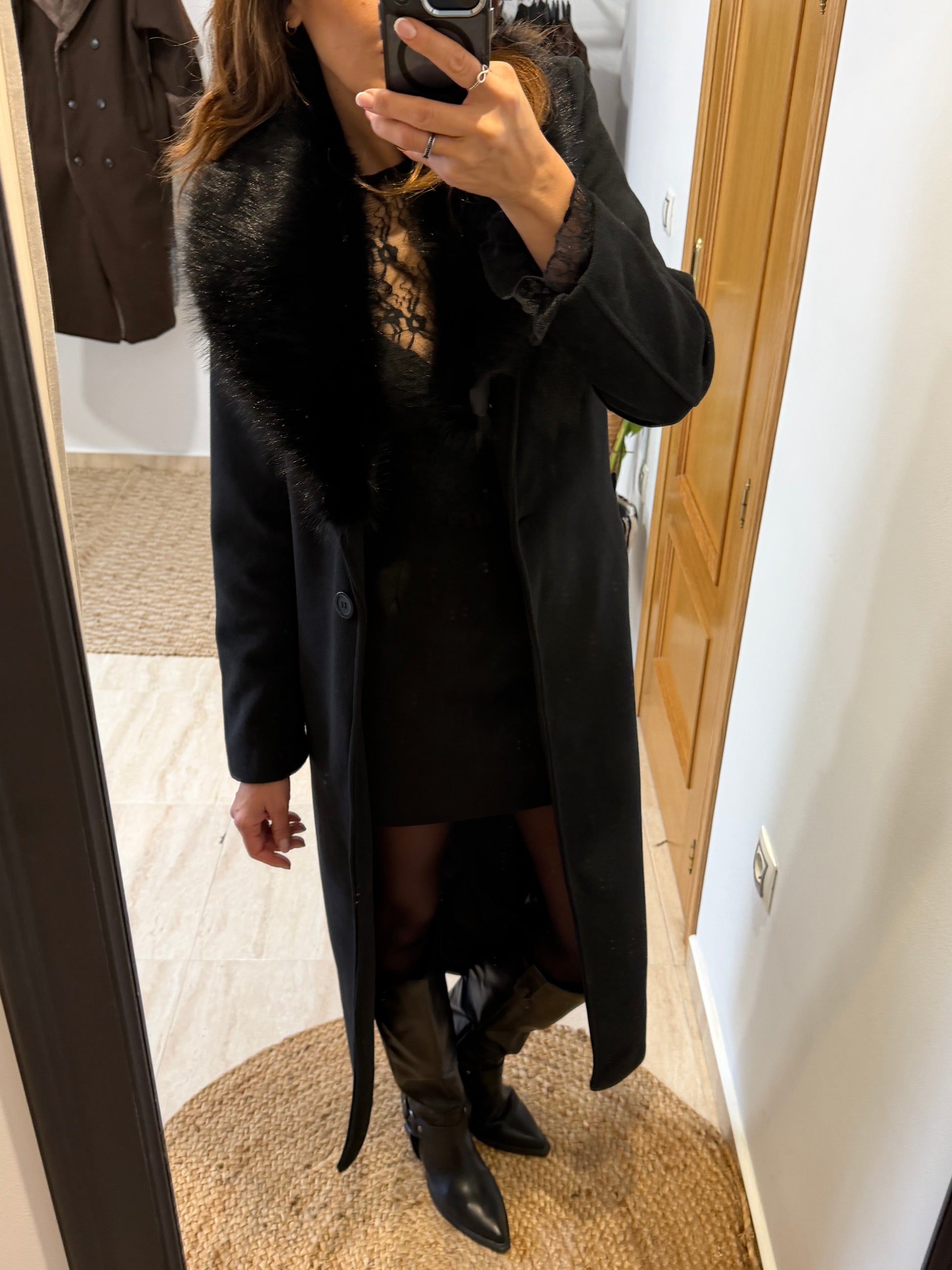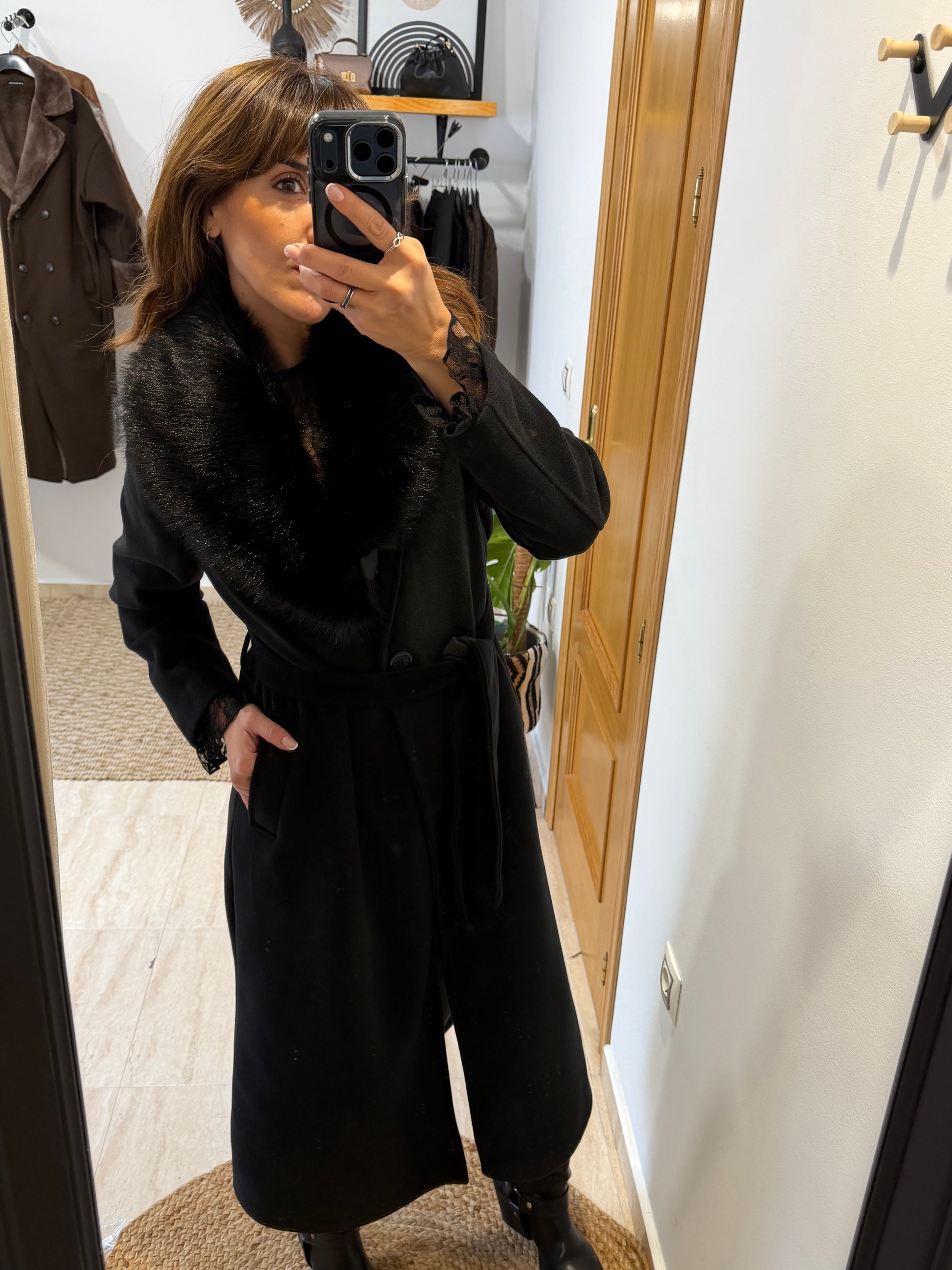 Abrigo de paño con cuello en piel sintética el cuello se puede extraer, incluye bolsillos y cinturón.