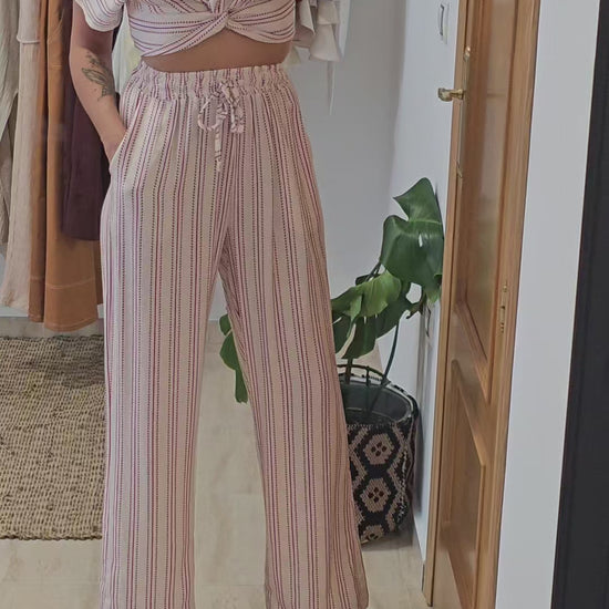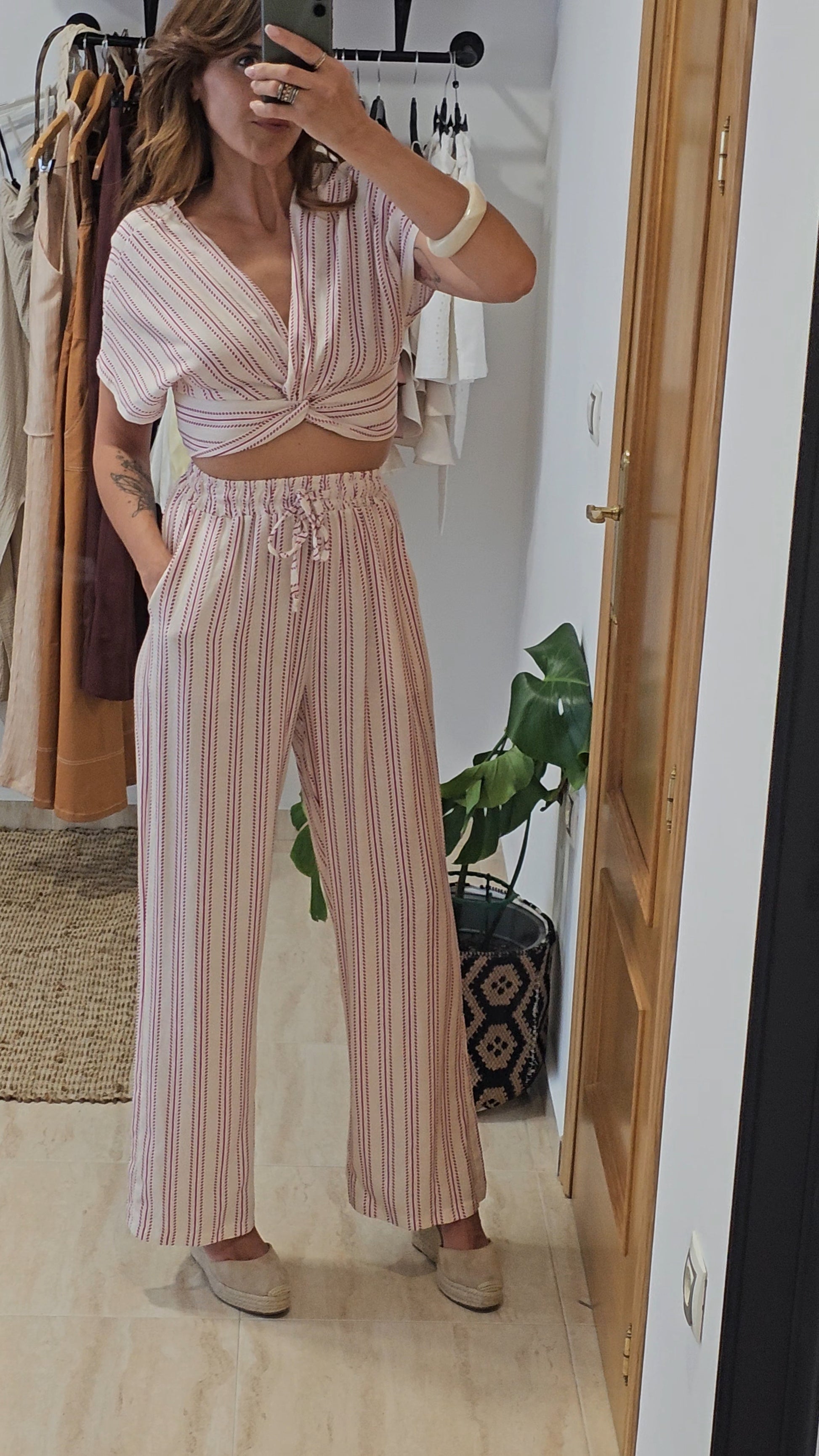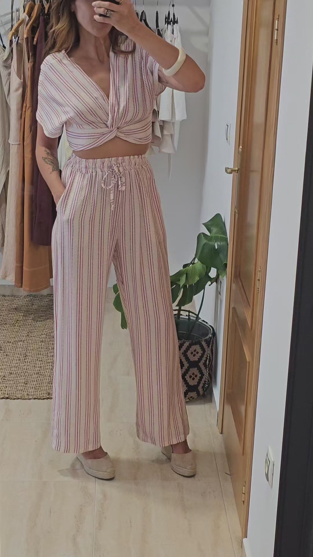 Este conjunto es ideal para esos días en los que buscas frescura sin renunciar al estilo. El top cruzado con nudo delantero y manga corta tiene un corte favorecedor y femenino, perfecto para lucir piel con elegancia. El pantalón palazzo con cintura fruncida y cordón ajustable combina comodidad y movimiento con un toque desenfadado que nos encanta.