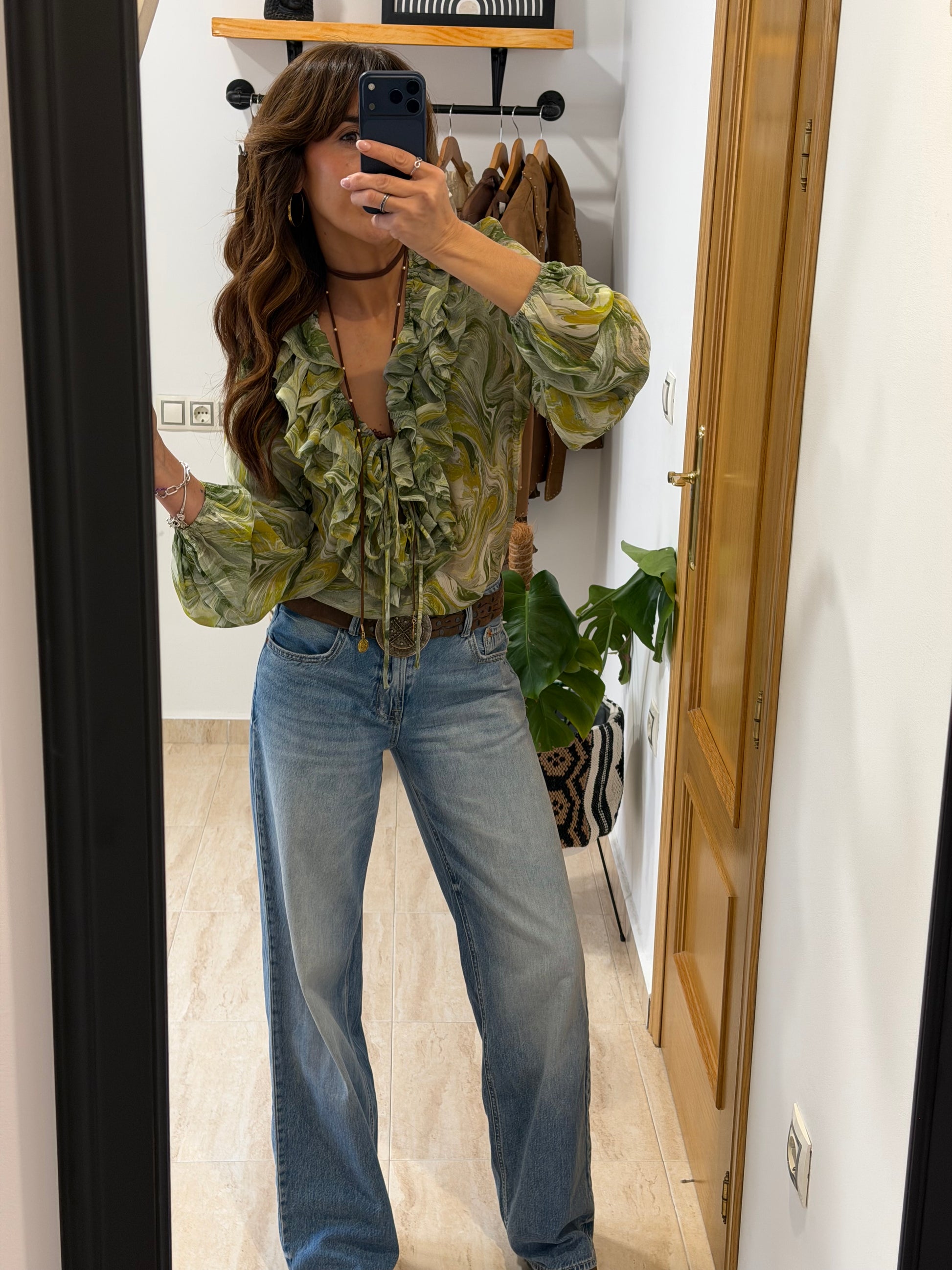 Blusa fluida, con escolte en V el cual se puede ajustar, detalle de mini volante bohemio en la parte delantera de la blusa, estampado marmolado en tonalidades verdes.
