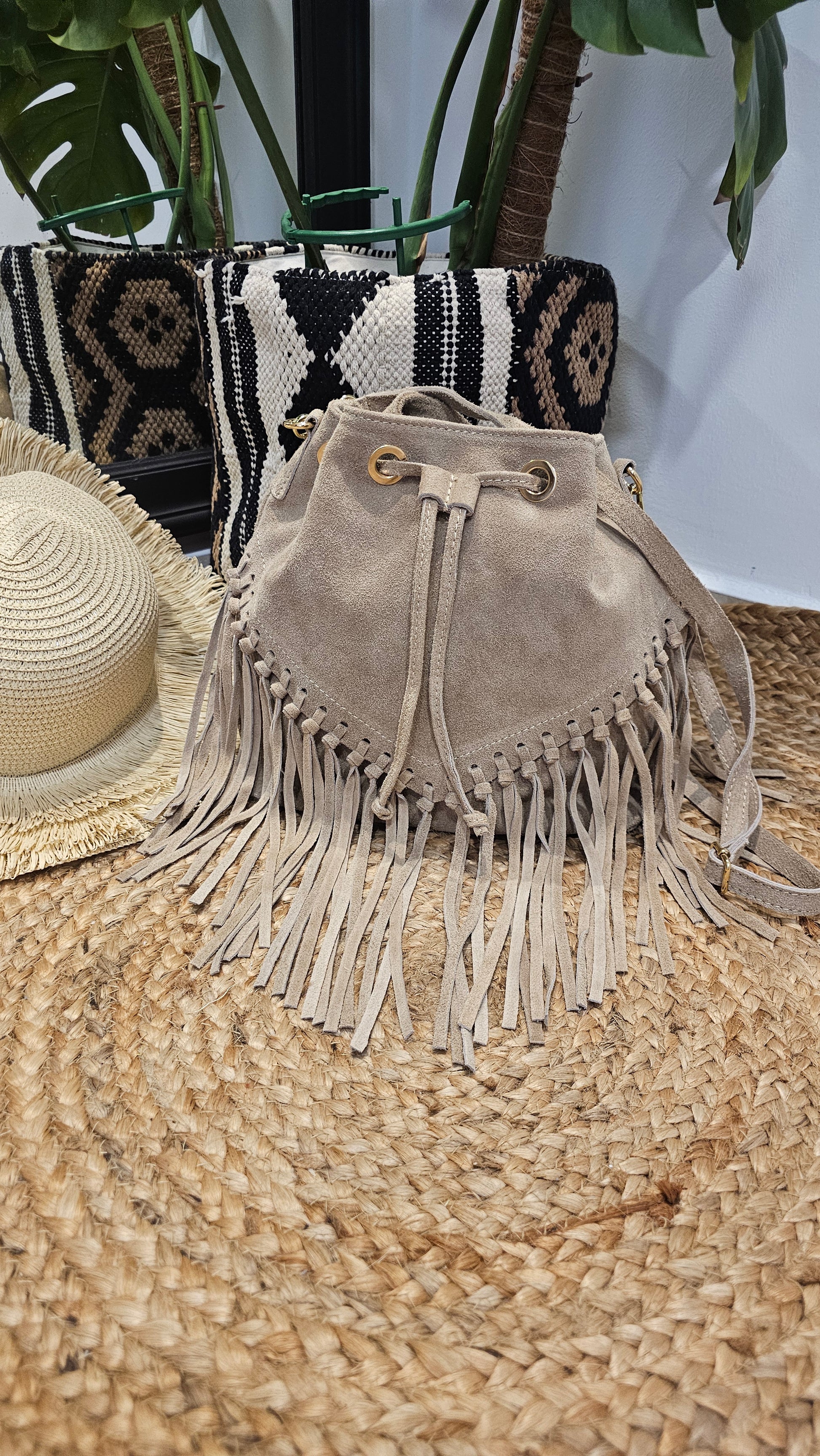 Bolso material serraje piel, cierre ajustando cordón, incluye interior con forro y bolsillo con cremallera, dimensiones alto 29cm ancho 36cm.