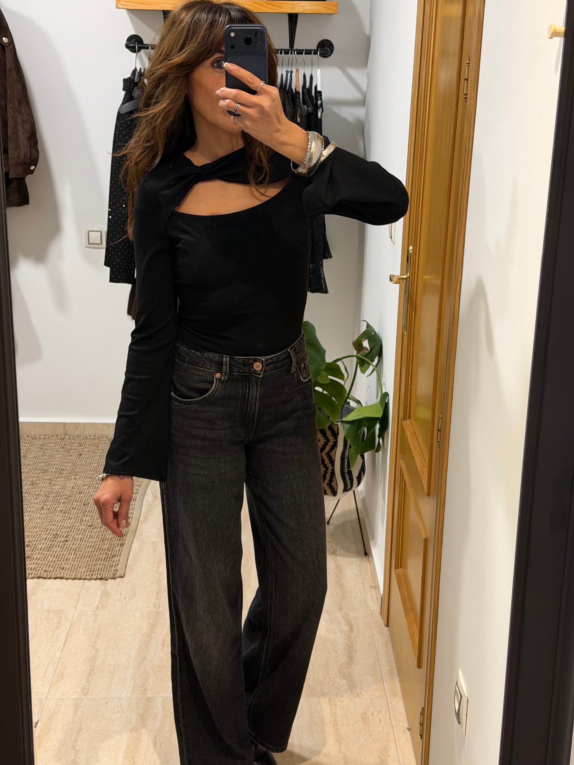 Camiseta con manga acampanada en color negro.