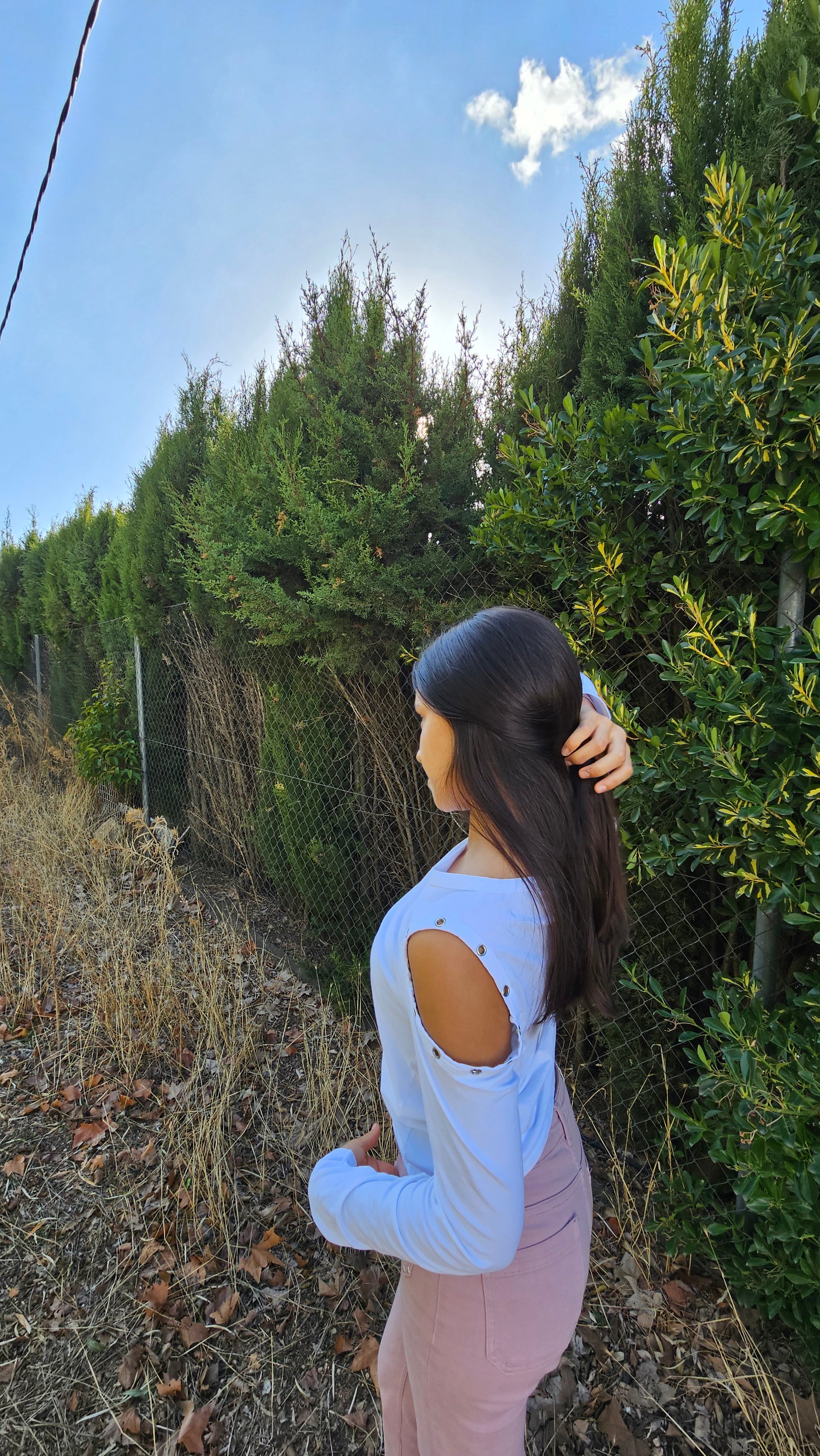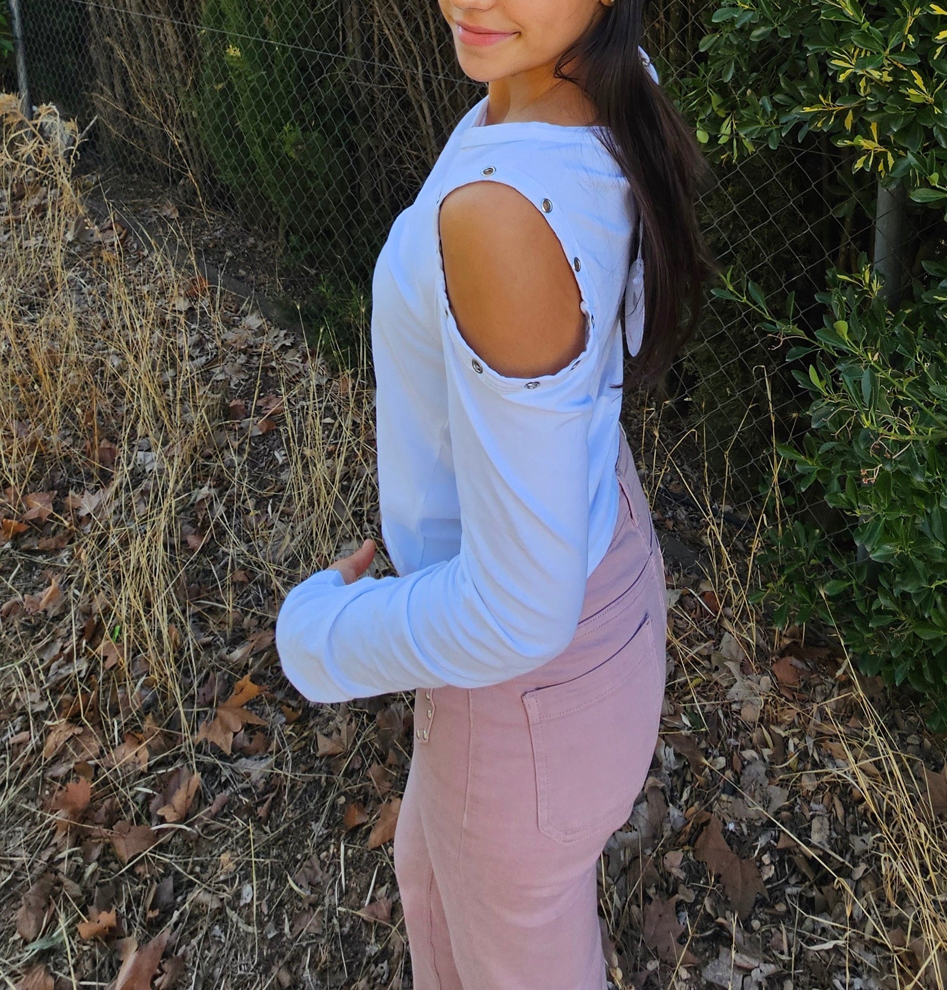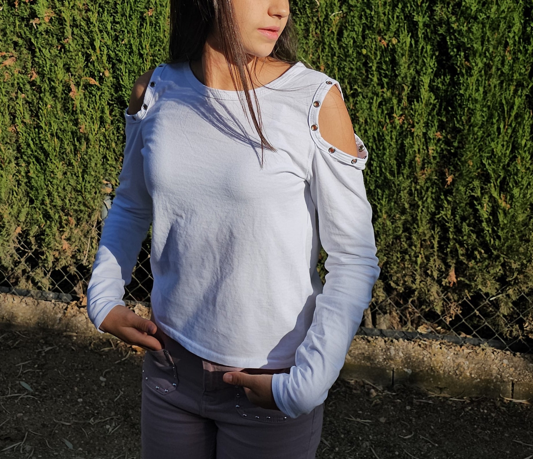 Camiseta manga larga con hombros descubiertos con detalles de arandelas metálicas en la zona de los hombros.