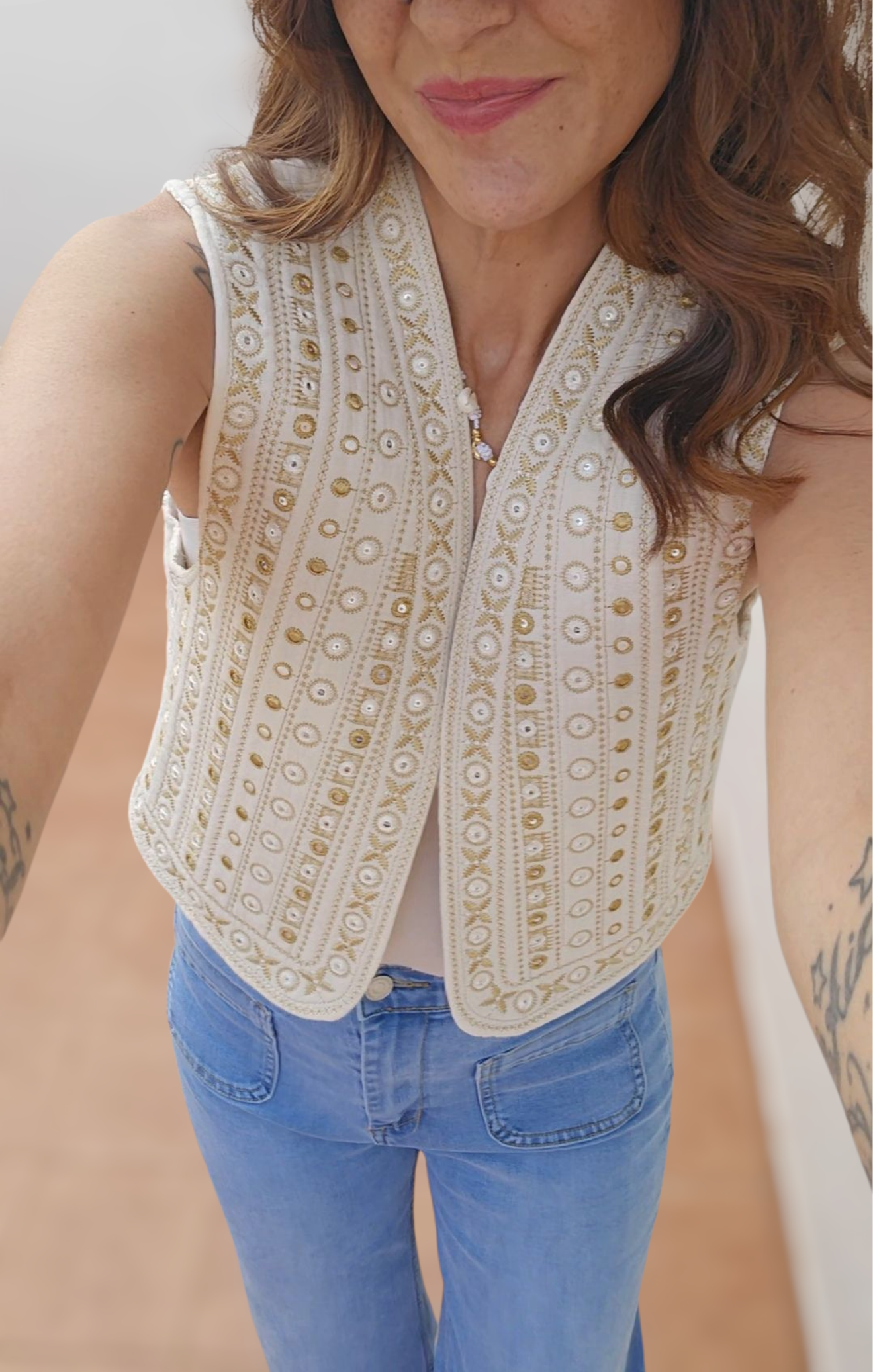 Chaleco bordado estilo boho chic, confeccionado en tela ligera con detalles en hilo dorado y aplicaciones metálicas. Perfecto para combinar con jeans de mezclilla y dar un toque elegante y desenfadado a tu look.