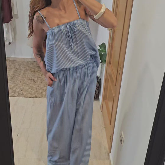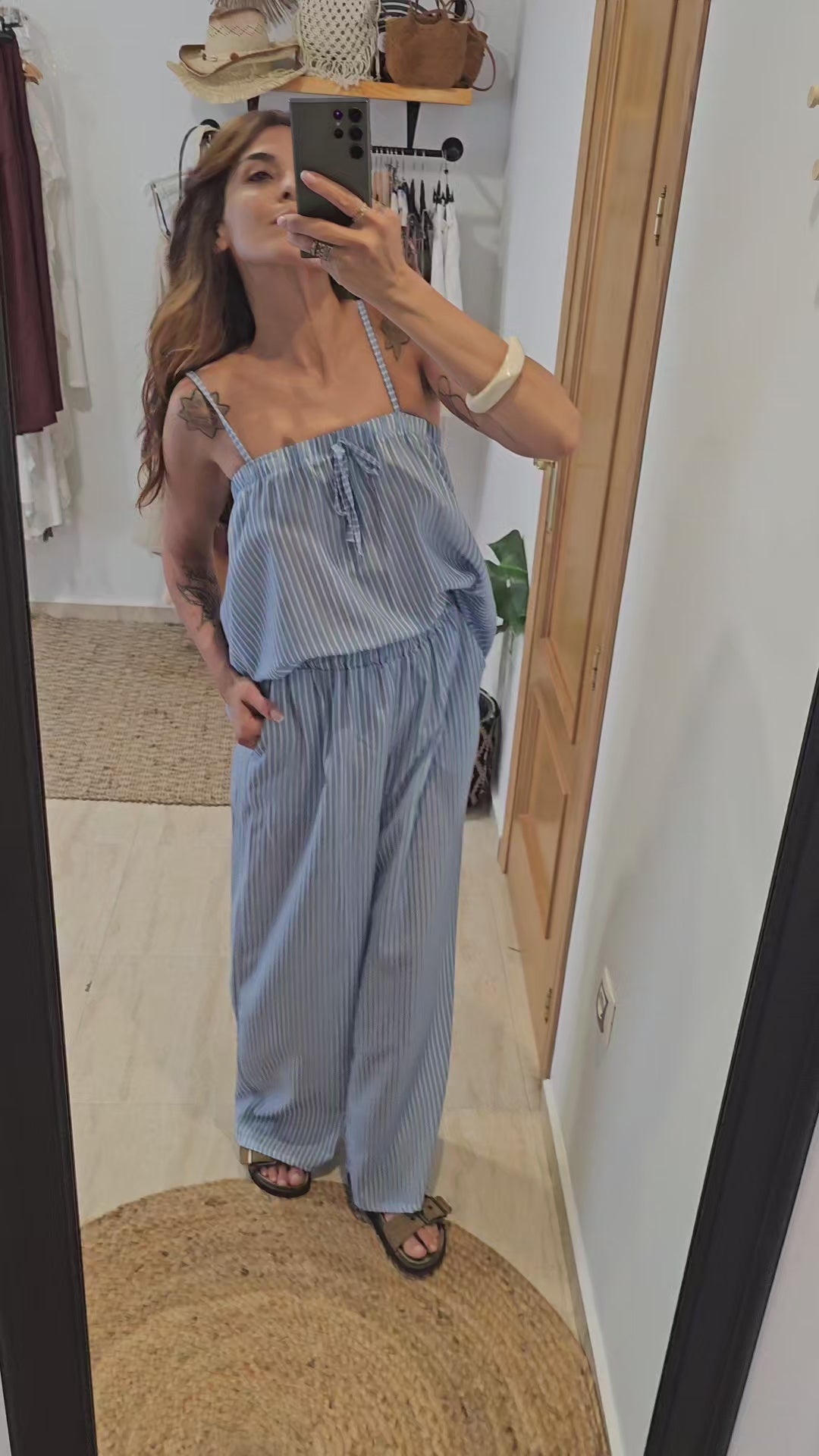 Este conjunto de dos piezas top de tirantes y pantalón palazzo es la definición de un look relajado pero con estilo. Confeccionado en un tejido ligero de rayas verticales en tonos azul cielo y blanco, es perfecto para los días cálidos de verano. El top con escote elástico y detalle de lazo frontal aporta un toque delicado, mientras que el pantalón de tiro alto con cintura elástica garantiza comodidad y libertad de movimiento.