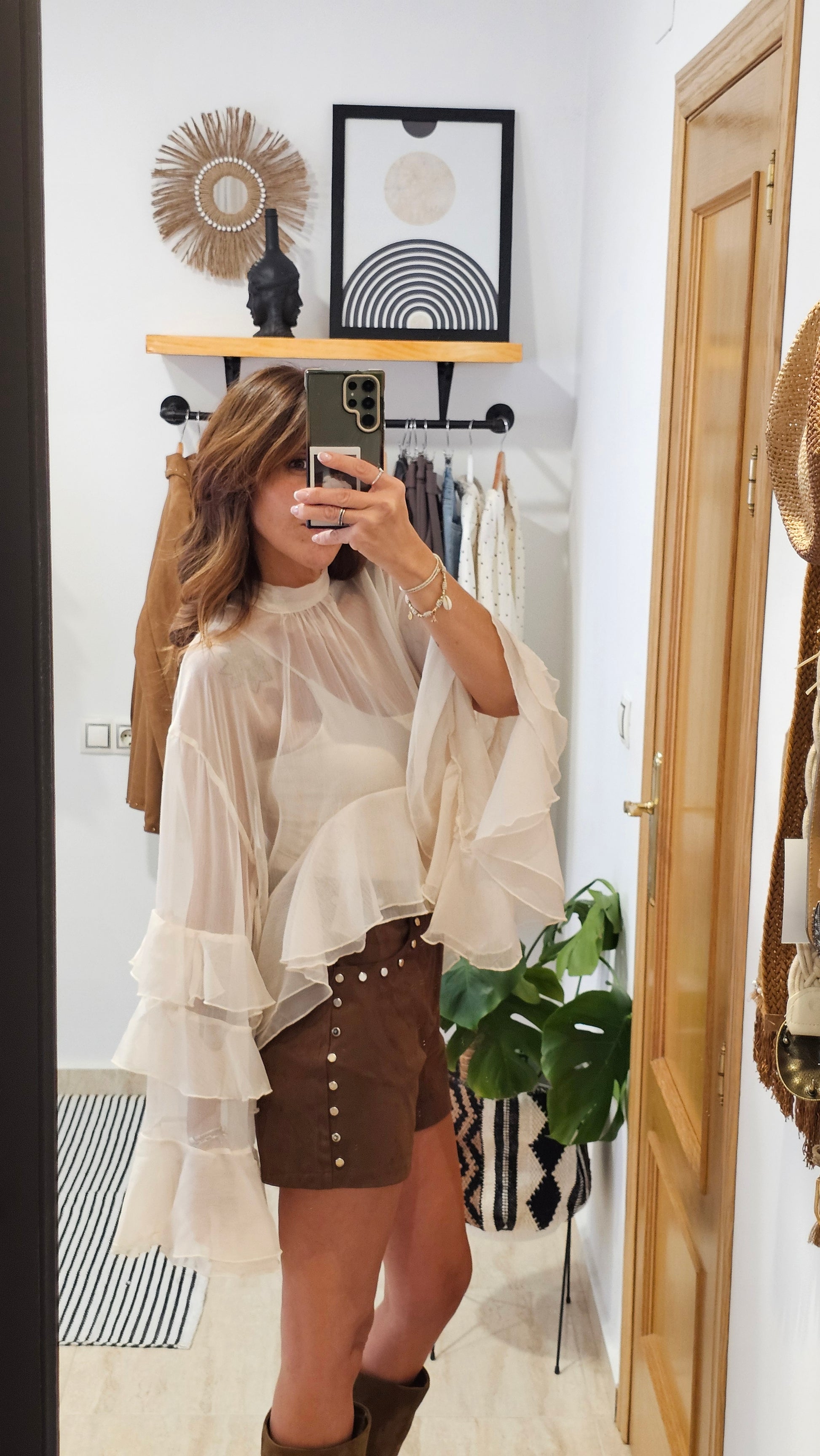 Short marrón efecto ante con detalle de tachuelas en los ribetes de cintura,bolsillo y costuras laterales.