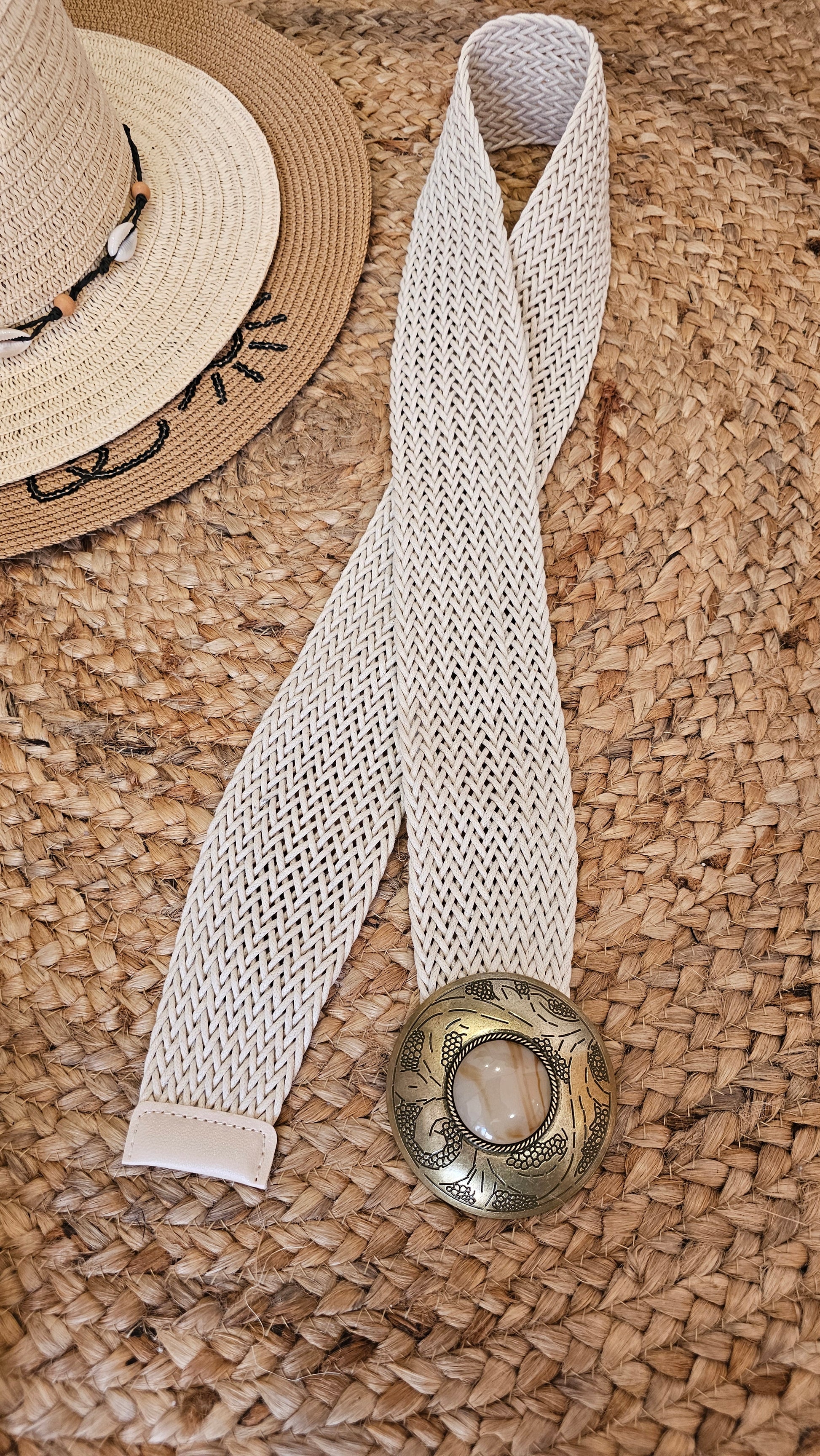 Cinturón con hebilla circular con detalle en el centro de piedra tallada, largo 1,10 cm