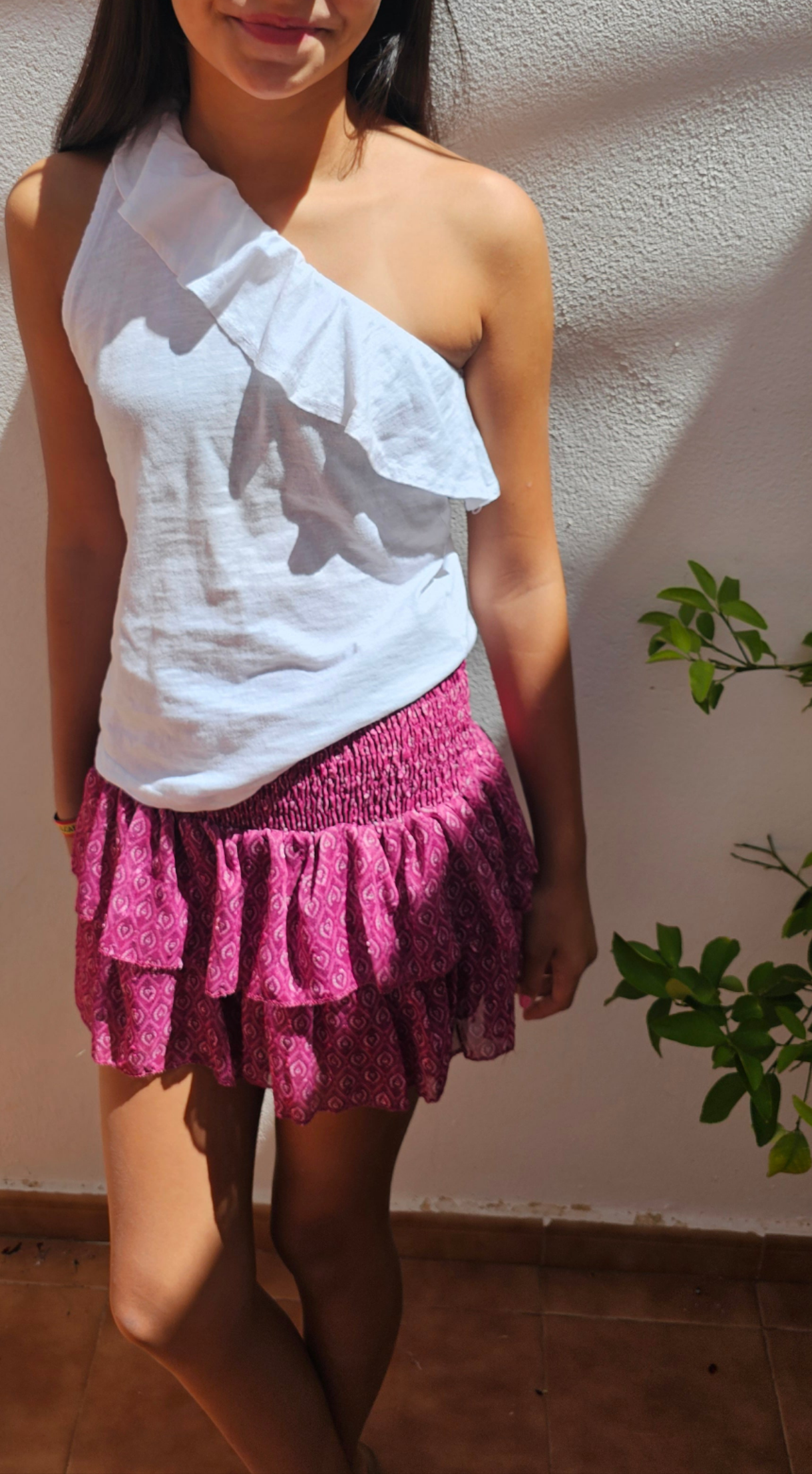 Falda ARI, es una falda corta de volantes de gasa con estampado y engomado de panel de abeja. 97% poliester y 3% elástico.