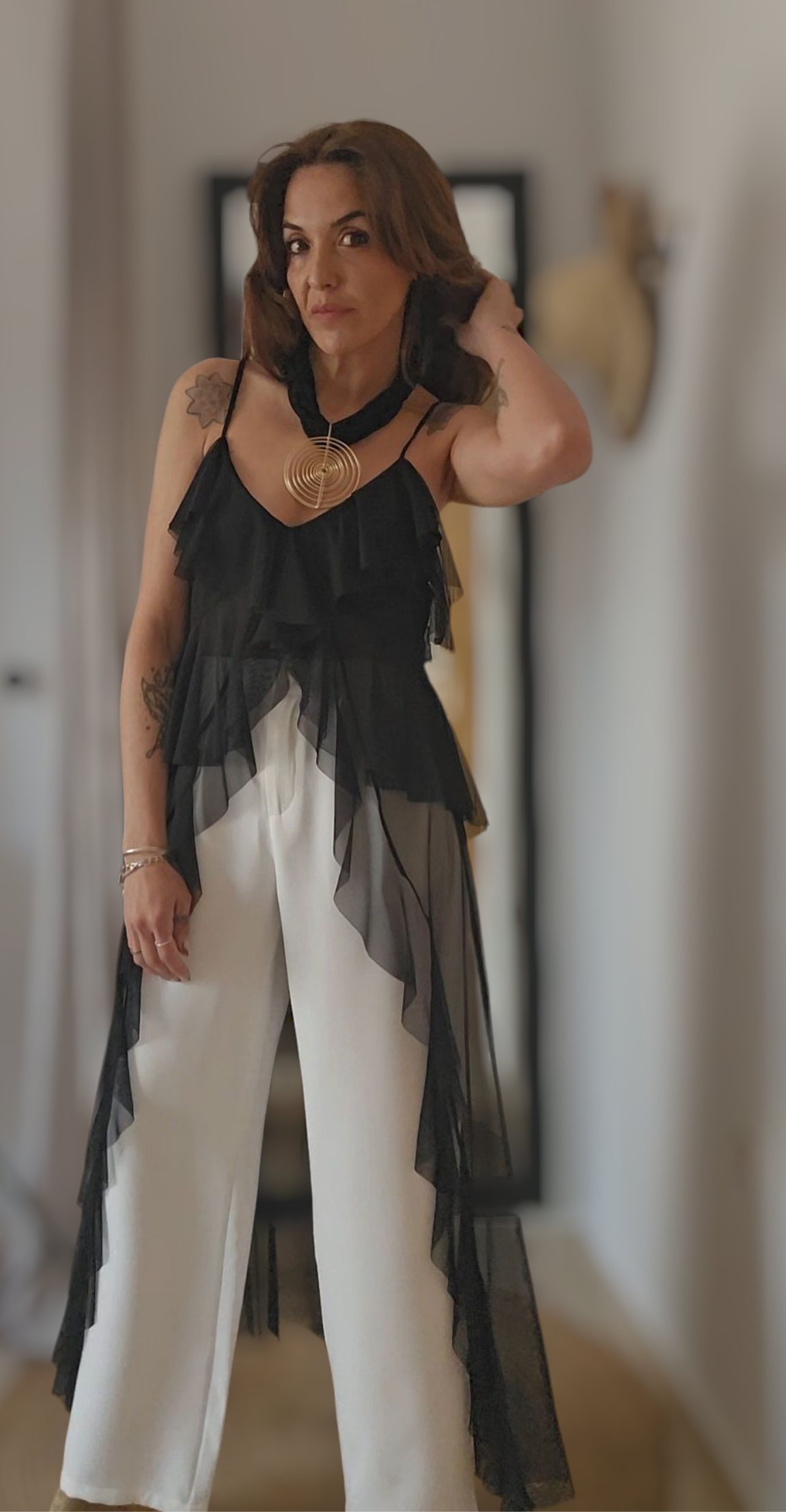 Top largo con tirantes ajustables, la modelo lleva la talla S/M talla 36-38 estatura 1,69cm.