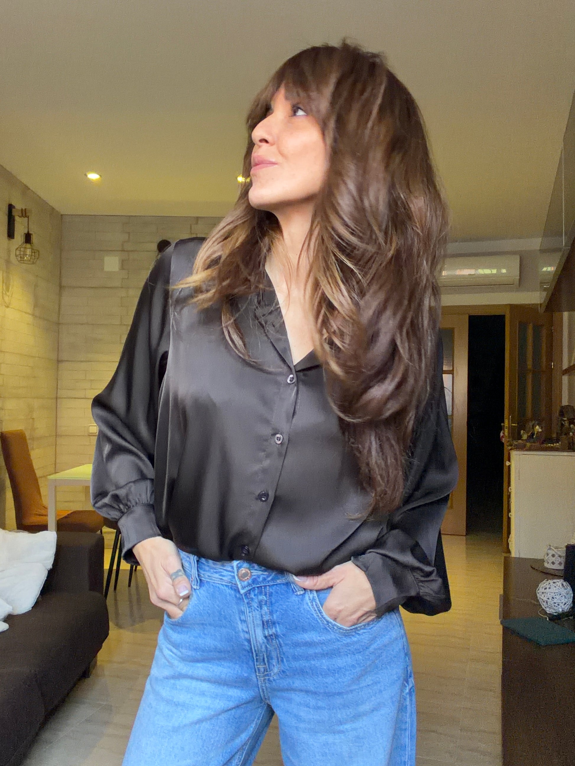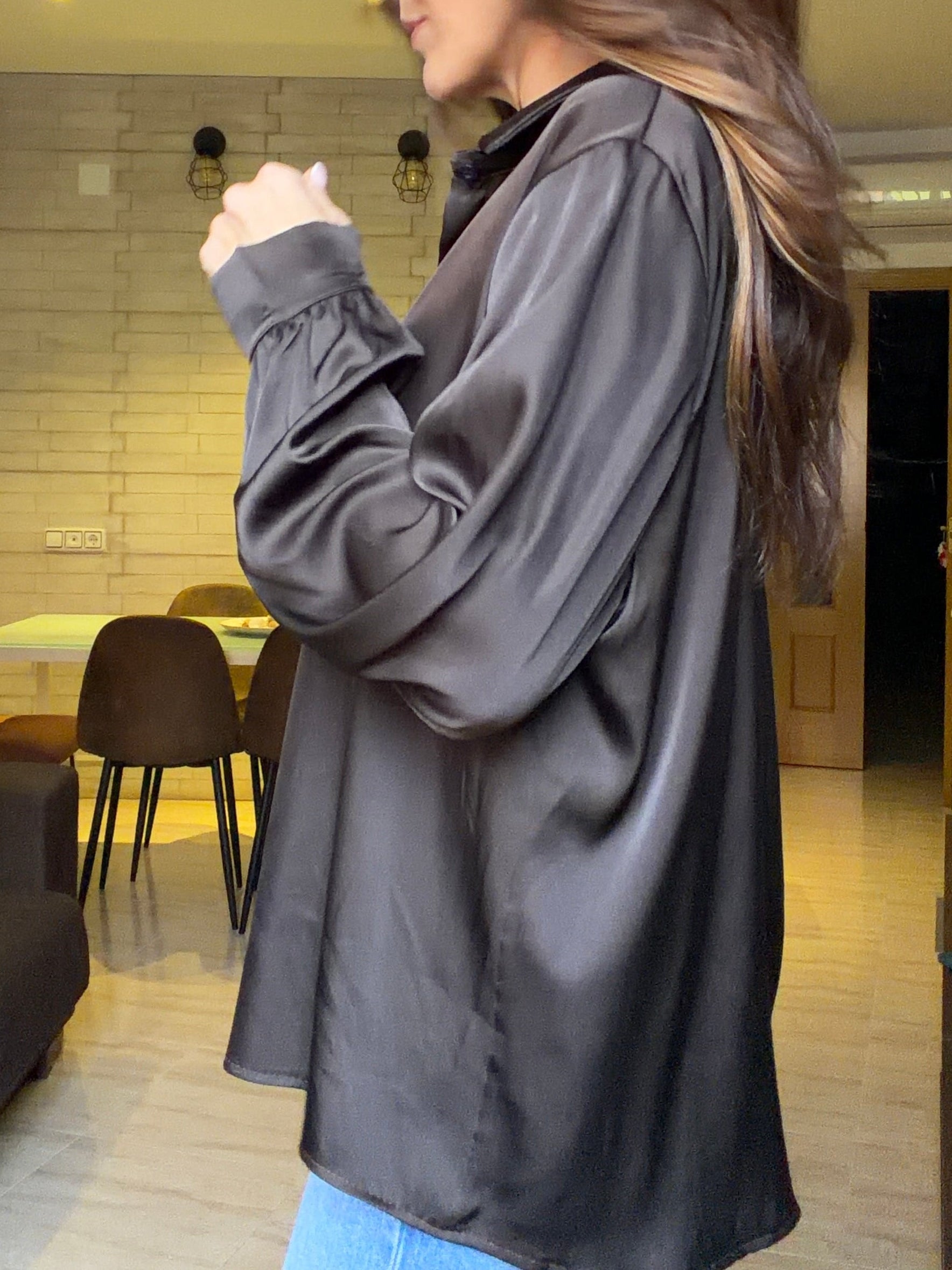 Camisa en tono marrón café, composición satén, talla única se adapta perfectamente desde la talla 34 hasta la talla 42.